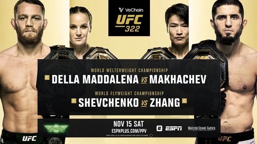 В ночь на 16 ноября на культовой арене Madison Square Garden в Нью-Йорке (США) пройдет турнир UFC 322. Ислам Махачев может стать первым российским бойцом, кто взял пояс в двух дивизионах, но для этого ему предстоит справиться с Джеком Деллой Маддаленой – чемпионом в полусреднем весе. Вейли Жанг поднялась в легчайший вес к Валентине Шевченко с такой же целью – взять титул во втором весе. Также нас ждут бои с участием Романа Копылова и Байсангура Сусуркаева. MMA.Metaratings.ru рассказывает о дате и карде UFC 322, где смотреть поединки и отвечает на главные вопросы о турнире...