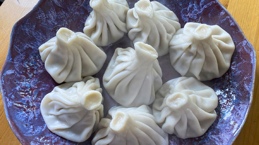 Тесто: Начинка: Приготовление: Тесто: мука + вода + соль → месить 10 мин (или 20 мин в тестомесе). Завернуть в плёнку, отдохнуть 20 мин. Мясо замочить в воде 30 мин, пропустить через мясорубку (средняя сетка). Фарш: добавить тёртый лук, чеснок, чили (сухой + свежий), кинзу, соль, перец. Постепенно вливать воду, постоянно мешая — фарш должен быть сочным. Тесто разделить на кусочки по 40 г → раскатать тонкие кружочки...