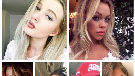 На фотографиях жены наших футболистов: - в верхнем ряду слева направо: Анастасия, жена Никиты Трямкина и Наталья, жена Константина Барулина, - в нижнем ряду слева направо: Николь, жена Ильи Ковальчука, Дарья, жена Александра Радулова, Ирина, жена Василия Кошечкина и Екатерина,жена Никиты Нестерова. Посмотрите на этих женщин. Вроде как они разные, и мужья у них разные, но вот сколько я на них не смотрю, никак не могу запомнить, кто есть кто. Брови домиком, выпученные глаза и перекачанные губы, которые постоянно открыты...