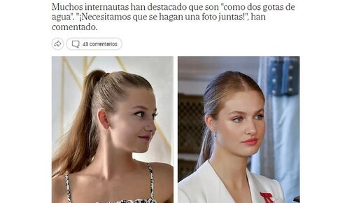 Вот что пишет издание El Mundo: "Многие пользователи Сети отметили, что они "как две капли воды похожи". "Нам нужно, чтобы вы сфотографировались вместе!" - прокомментировали они. С тех пор, как принцесса Леонора (18 лет) достигла подросткового возраста, пресса начала искать в ней явное сходство с некоторыми членами королевской семьи. Например, в 2020 году считалось, что она была похожа на дочь Виктории Луизы Прусской, бабушки королевы Софии по материнской линии. В прошлом году также было замечено,...