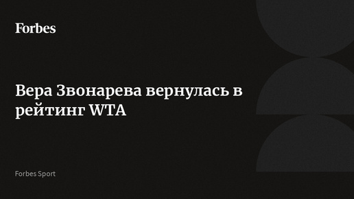 Российская теннисистка Вера Звонарева вернулась в рейтинг Женской теннисной ассоциации (WTA), обновленная версия которого опубликована на сайте организации. В воскресенье Звонарева проиграла хорватке Петре Марчинко в финале турнира Международной федерации тенниса (ITF) категории W100 в Дубае, на котором она провела свой первый матч в 2025 году и одержала первую победу с весны 2024 года. Звонаревой 41 год. Она выиграла 12 титулов WTA в одиночном разряде и дважды выходила в финал турниров Большого шлема...