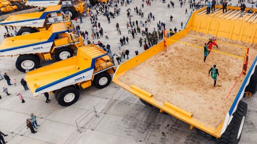 В Республике Беларусь в рамках празднования Дня Машиностроителя прошёл выставочный шоу - матч с участием звёзд пляжного волейбола. Серебряный призёр Чемпионата России, обнинский волейболист Дмитрий Веретюк в паре с призёром Олимпийских игр Вячеславом Красильниковым сыграли против Александра Дедкова и Павла Петрушко - чемпионов Республики Беларусь. Для этого матча в кузов самого большого карьерного самосвала в мире загрузили почти 400 тонн песка; матч проходил на высоте третьего этажа. Мероприятие состоялось на территории завода «БелАЗ» в городе Жодино...
