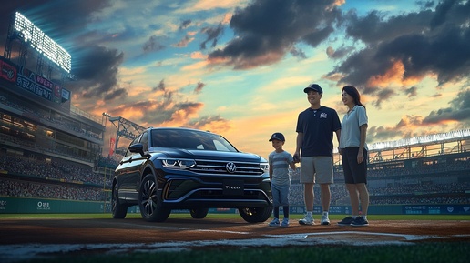 Создано на основе запроса: realistic picture of a korean baseball fan family, which includes dad, mom and one son, taking picture with the volkswagen Tiguan infront of a baseball stadium --- Автоперевод: Реалистичная картина семейства фанатов...