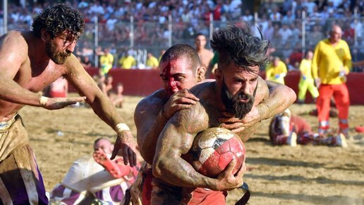 Для тех, кто устал от симулянтов в футболе и считает, что в регби недостаточно насилия, идеально подойдет флорентийский кальчо — кровавый командный спорт, в который играют не просто «настоящие мужчины», а неистовые берсерки со сбитыми кулаками. Для того чтобы поиграть в кальчо нужно не так много — засыпанное песком поле на площади Санта-Кроче во Флоренции размером 50 на 100 метров, пятьдесят четыре здоровых мужика и мяч, вроде баскетбольного, набитый козьей шерстью. Если с двумя последними пунктами все более-менее ясно, то первый — дань древней традиции...