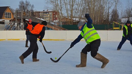 100 мужчин и одна девушка сыграли в хоккей в валенках в Вихоревке