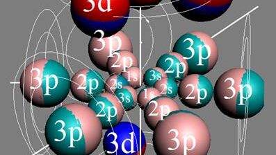 Электронная оболочка атома железа Fe, валентность 8. Красно-синиим цветом выделены сферы непроницаемости восьми полярных и приполярных валентных 4s и 3d электронов. См. Рис. 1. Электронная формула атома железа Fe - 1s2 2s2 2p6 3s2 3p6 3d6 4s2 в свёрнутом виде [Ar] 4s2 3d6. Где [Ar] кор – инертное ядро электронной оболочки атома железа Fe состоящее из не валентных электронов аргона - Ar. См. Рис. 2. Как видим электронная оболочка атома железа Fe отличается от аргона Ar наличием дополнительных восьми 4s2 3d6 электронов, выделенных сине – красным цветом...