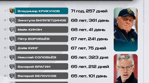 🐆 Владимир Крикунов провёл свой последний матч в КХЛ в 2022 году за рижское «Динамо» в возрасте 71 года и с тех пор единолично возглавляет