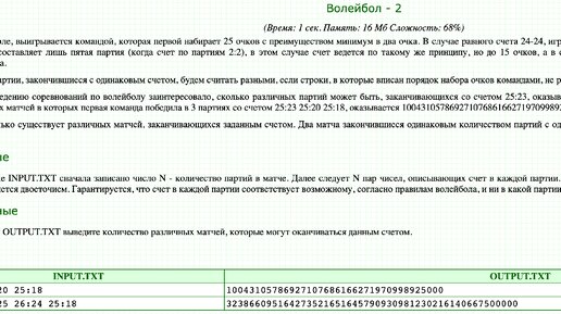 Разберём сразу две задачки, потому что там одинаковые рассуждения формулы. Читаем условия: Разбор начнём с первой задачи, но писать код будем сразу для второй, потому что первая - это подзадача второй, и я думаю, что вы сможете самостоятельно выкинуть лишнее. Без потери общности будем считать, что выиграла первая команда (если это не так, то всегда можем поменять местами). Рассмотрим на примере, когда синяя команда выиграла со счётом 25:7. Если нарисовать в ряд порядок, в котором команды набирали очки, то получится что-то похожее на рисунок сверху...