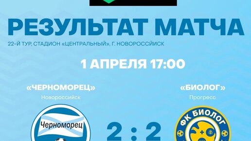 Волевая ничья на своем поле 01 апреля 2023 года в Новороссийске на стадионе Центральный в присутствии 5000 зрителей футбольный клуб Черноморец одержал волевую ничью с футбольным клубом Биолог. Полузащитник футбольного клуба Черноморец Юра Будагян дал отличнейшую передачу. А нападающий футбольного клуба Черноморец Магомед Абакаров забил гол на 42 минуте в ворота футбольного клуба Биолог. На 45 минуте от защитника футбольного клуба Черноморец Владислава Кириленко засчитан автогол. На 55 минуте...