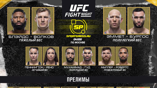 Полный список боёв турнира UFC Волков - Блэйдс 21 июня