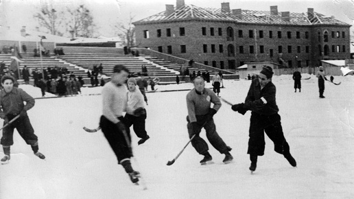 На снимке момент матча по хоккею с мячом на стадионе "Динамо". Достраивается дом №43 по Пушкинской, который будет введён в эксплуатацию в 1952 году. За старыми трибунами можно рассмотреть крыши и печные трубы домов, что стояли раньше вдоль Пушкинской, а сейчас на их месте площадка между забором и трибунами стадиона...