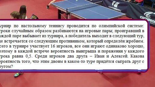 Вашему вниманию предлагается подробное решение (один способ) и "формальное" (для тех, кто не любит заморачиваться) Вспомним условие Для начала ответим на вопрос: Сколько будет туров? Если в турнире участвует 16 игроков, то в первом туре будет сыграно 8 партий, во втором туре 4 партии, в третьем туре 2 партии, в четвёртом туре 1 партия. Итак, будет четыре тура. Разберём возможные комбинации, а именно 1) Иван и Алексей сыграют друг с другом в первом туре; ИЛИ 2) Иван и Алексей сыграют друг с другом...