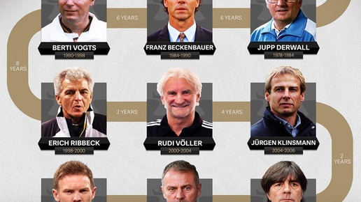 Все тренеры сборной Германии с 1926 года ⚽️🇩🇪 10 лет в качестве тренера - Отто Нерц 20 лет* - Зепп Хербергер 14 лет - Хельмут Шён 6 лет - Юпп Дерваль 6 лет - Франц Беккенбауэр 8 лет - Берти Фогтс 2 года - Эрих Риббек 4 года - Руди Фёллер 2 года - Юрген Клинсман 15 лет - Йоахим Лёв 2 года - Ханс-Дитер Флик 2 года ...
