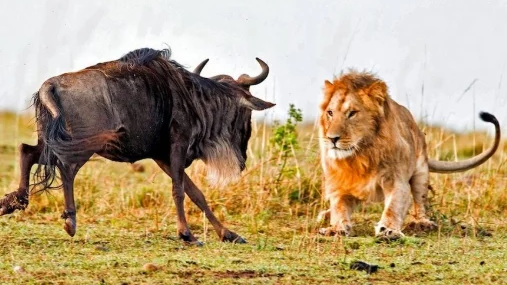 Лев опередил львицу и сам завалил антилопу одним стремительным прыжком