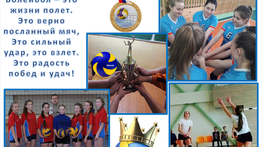 Волейбол - это жизни полет. Это верно посланный мяч, это сильный удар, это взлет. Это радость побед и удач! Автор фотоколлажа: Рамазанов Вадим, ученик 8 класса МБОУ СОШ с. Карлыханово