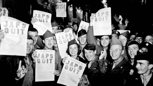 American servicemen in the Rainbow Corner Red Cross Club in Paris are happy to win over Japan, posing with the Paris Post newspapers, with the headlines “JAPS QUIT”.
