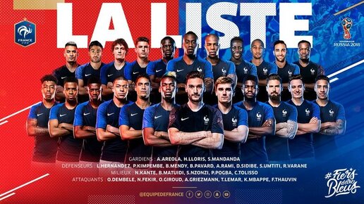 Главный тренер сборной Франции Дидье Дешам огласил заявку национальной команды на чемпионат мира–2018. В список вошли 23 игрока: Вратари: Альфонс Ареола (ПСЖ), Уго Льорис ("Тоттенхэм"), Стив Манданда ("Марсель"); Защитники: Лукас Эрнандес ("Атлетико"), Преснел Кимпембе (ПСЖ), Бенжамен Менди ("Манчестер Сити"), Джибриль Сидибе ("Монако"), Адиль Рами ("Марсель"), Бенжамен Павар ("Штутгарт"), Самуэль Умтити ("Барселона"), Рафаэль Варан ("Реал"); Полузащитники: Блез Матюиди ("Ювентус"), Поль Погба...