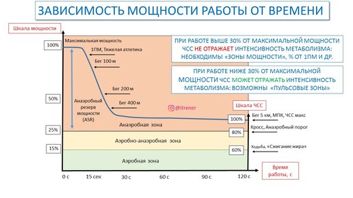 "Зоны мощности" - концепция, которая используется при планировании тренировок на выносливость. Периодически натыкаюсь на путаницу в этом вопросе - в каких единицах измерять, какие эффекты в какой зоне и прочее. Давайте попробуем обозначить основные моменты. ✔️Главное - наши мышцы производят усилие. Существует фундаментальная зависимость - интенсивность этого усилия обратно пропорциональна времени его удержания (Рис.1); ✔️Хочу мощно - значит будет очень коротко, хочу долго - значит будет не мощно...