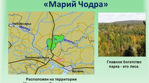 НАЦИОНАЛЬНЫЕ ПАРКИ В РОССИИ. "МАРИЙ ЧОДРА." Приветствую Вас, читатель! Государственный природный национальный парк находится в юго-восточной части Республики Марий Эл. В переводе на русский язык это название означает "Марийский лес." Парк был учреждён в 1985 году. Основная река парка - Илеть. "Марий Чодра" знаменит своими озёрами. Почти все они - карстовые. Они очень популярны как объекты летнего отдыха местных жителей и туристов. Здесь растут хвойно-широколиственные леса, где встречаются медведи и волки...