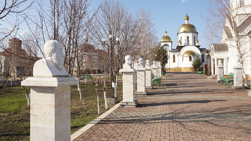 Вход на территорию Петропавловского храмового комплекса. Перед входом в храмовый комплекс. На территорию комплекса попадаешь, через аллею античных статуй, представляющих сообщество греческих философов. В архитектурный ансамбль Петропавловского храмового комплекса входит два храма - Успенский и Петропавловский, а также четыре часовни...