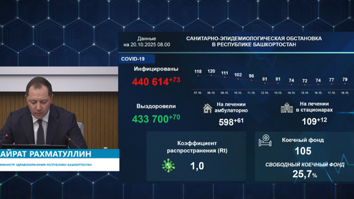 В Башкортостане медики выявили 73 новых случая заражения коронавирусом за сутки. Об этом на оперативном совещании доложил министр здравоохранения Айрат Рахматуллин. Он отметил, что на стационарном лечении сегодня находятся 109 заболевших, а в амбулаторном режиме лечатся 598 инфицированных...