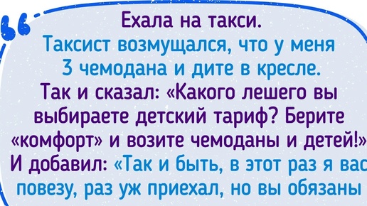 Поездки на такси давно стали обыденностью, и ни водитель, ни пассажиры не ждут от них какой-то феерии. Но иногда в одной машине встречаются такие кадры, что хоть трагикомедию снимай. Ехала на такси. Таксист возмущался, что у меня 3 чемодана и дите в кресле. Так и сказал: «Какого лешего вы выбираете детский тариф? Берите „комфорт“ и возите чемоданы и детей!» И добавил: «Так и быть, в этот раз я вас повезу, раз уж приехал, но вы обязаны докинуть мне на чай до стоимости „комфорта“!» © iscelenie70 / Pikabu Подъезжаю на заказ, садится мама с ребенком...