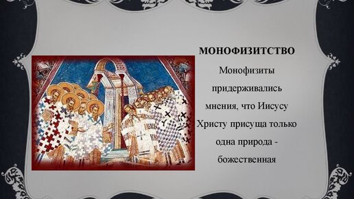 Монофизиты - (евтихианство) - секта, признававшая во Христе одну лишь воплощенную божественную природу. Учение монофизитов, распространившееся на Востоке, утвержденное на т.н. "разбойничьем соборе" в Эфесе в 449 г. , было осуждено в Халкидоне в 451 г. как еретическое; после этого монофизиты отделились от государственной церкви. Монофизиты распространены в Египте, Сирии и Месопотамии (здесь называются иаковитами). Из учения монофизитов произошли церкви армянская, абиссинская и коптская. (Ф.А. Брокгауз, И...