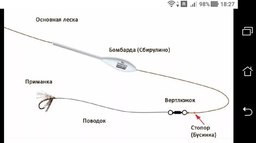 Здравия желаю. Собрать спиннинг для ловли бомбардой очень просто и легко понимая как устроена эта оснастка на хищника. Правильная схема оснастки спиннинга Бомбарда "Сбирулино" Правильная сборка оснастки на спиннинг Бомбарда "Сбирулино" На основную леске в зависимости от веса Бомбарды и ее назначения в каких слоях воды ловить рыбу. Основная леска диаметр может быть от 0.20 мм до 0.30 мм надеваем саму бомбарду "Сбирулино" и на конце привязываем вертлюжок с помощью рыболовного узла. Как вязать вертлюжок...
