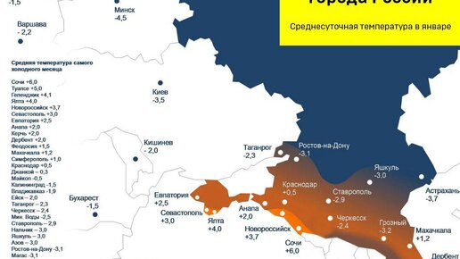 Самые теплые города России Январь и февраль – самые холодные месяца для большинства городов России. В каких городах наиболее тепло в этом время? 1. Сочи +6 2. Туапсе +5 3. Геленджик +4,1 4. Ялта +4 5...