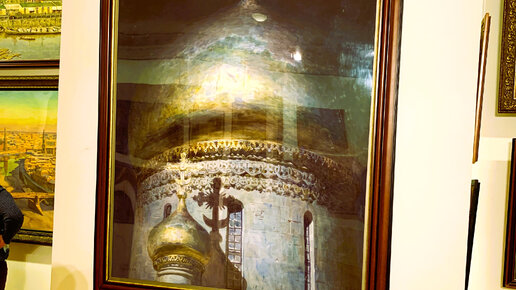 Сделать качественное фото было очень сложно. Неудачно падал свет . На картинах были тени и блики. Здесь видна моя тень. Акварель завораживает. Этот купол завораживает. В интернете прочла, что Андрияка писал эту акварель долго , почти шесть месяцев. В яндекс-картинках есть качественное фото этой акварели. Кто захочет , может посмотреть. Мне повезло увидеть акварель на выставке Сергея Андрияки "К 65-летию со дня рождения", которая проходила в Московском Выставочном центре. Там же было представлено несколько больших полотен Москвы разных лет...