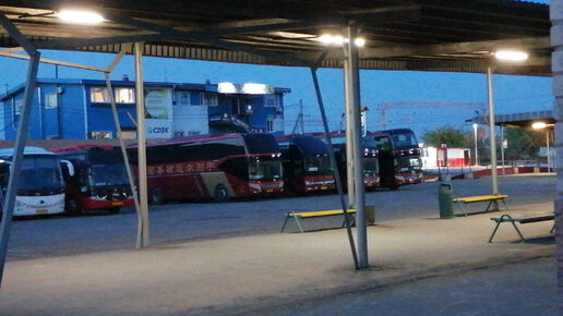 Всем доброго дня!!! Вот наконец-то и до меня дошла возможность посетить Китай после пандемии. Поездка осуществлялась по маршруту Владивосток-Хуньчунь-Яньцзи-Хуньчунь-Владивосток. Нас четверо человек. Выезд не совсем ранний - в 6-10 утра с автовокзала во Владивостоке, автобус китайский. С утра их тут 4 машины бордового цвета. Наш оказался второй слева. Автобус комфортный, удобный, кондиционер работает. Поездка 4 часа до границы. Русскую границу прошли быстро. Печальное состояние российских погранпереходов никуда за 3,5 года не делось...