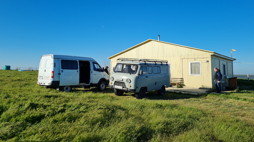 Заповедник "Черные земли" включает в себя 2 отдельных участка - орнитологический «Озеро Маныч-Гудило», на котором расположен кордон "Пеликан" и степной, где восстанавливают популяцию сайгака - в восточной части Калмыкии. На территории кордона несколько построек - 2 капитальных домика, несколько вагончиков и юрта, в которых можно разместиться. Светлый дом с буддистской крышей - что-то типа административного здания, справа от него - бревенчатая баня. Этот домик песочного цвета - гостевой. Был построен давным-давно, когда на