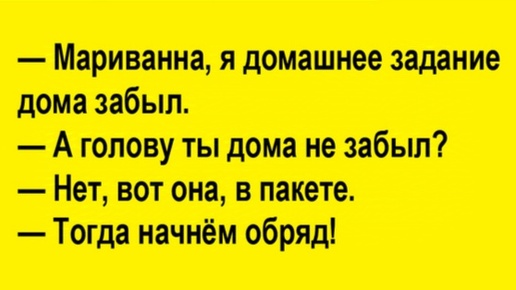 Топ 15 смешных анекдотов про школу. Последний самый смешной!🤣🤣🤣 1 сентября. Первоклассник Вовочка приходит домой из школы. Мама его спрашивает: - Сынок, и чему же ты научился? - Да уже много чему, но этого ещё не всё, учитель сказал, что нужно прийти ещё и завтра. Запись в школьном дневнике: "Ваш сын на уроке музыки три раза заказывал "Владимирский централ"... и не заплатил!". В школе вампиров ученики боятся получить кол. Мой младший брат - первоклассник. Он каждое утро садится на 137 троллейбус,...