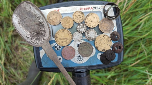 Прогулялся по скошенному полю с новым прибором equinox 900. Серебро всегда радует, видео появится на канале в рутубе https://rutube.ru/channel/65843751