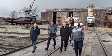 Генеральный директор АО «ХСЗ» Дмитрий Астафьев ознакомил и.о. министра с производственной площадкой предприятия и продемонстрировал технические возможности завода, строящееся судно на воздушной подушке СВП-50, а также суда, подготовленные для спуска к новой навигации.