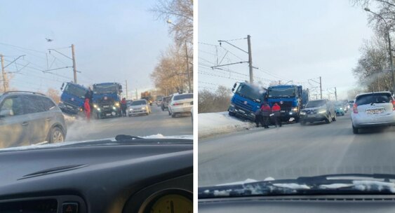 На дороге Тещин язык в Новосибирске произошло ДТП с участием двух самосвалов.КП - Новосибирск