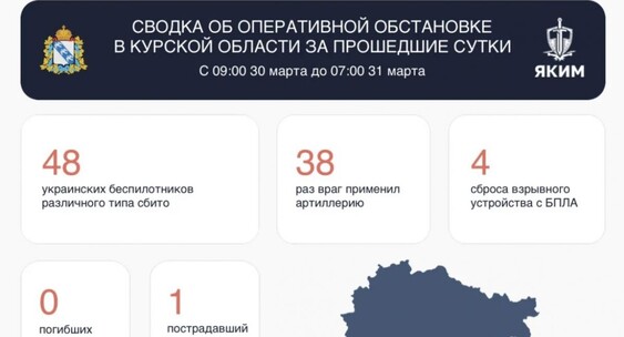 С 9 утра 30 марта до 7 утра 31 марта над Курской областью уничтожили 48 вражеских беспилотников. Отселенные районы 38 раз подверглись артиллерийским обстрелам. Еще 4 раза территорию атаковали дроны со взрывчаткой. Погибших нет.