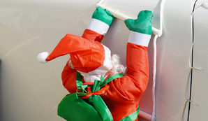 У горожан создалось впечатление, что Дед Мороз повис на автомобиле, потому что не может взобраться из-за внушительных габаритов.Подмосковье Сегодня