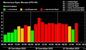 Магнитная буря, начавшаяся всплеском до сильной, G3, ранним утром вторника, 30 сентября, с двумя небольшими перерывами в середине дня среды и в начале нынешних суток, продолжается до сих пор.РБК