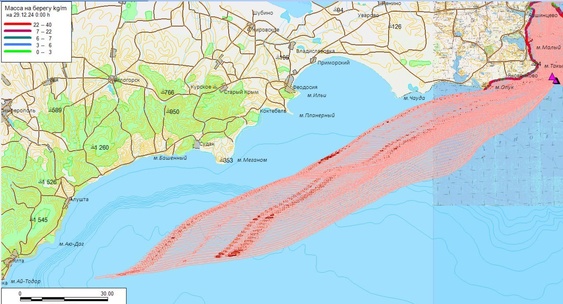 Модель предсказывает движение пятна на юго-запад, минуя Феодосийский залив, Судак и Алушту, прямо к Ялте.КИА