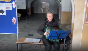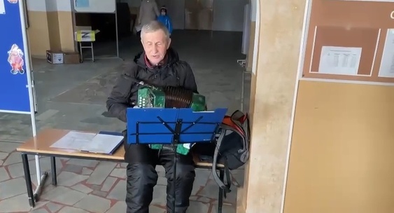 Житель Лыскова Александр Асафьев на избирательном участке с помощью музыкального инструмента создает праздничную атмосферу.В Городе N