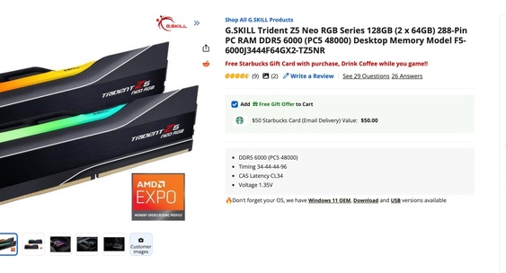 Вместо добавления ещё одного компонента ПК, Newegg предлагает подарочную карту Starbucks на $50 в комплекте с двумя высокопроизводительными комплектами оперативной памяти DDR5.3DNews
