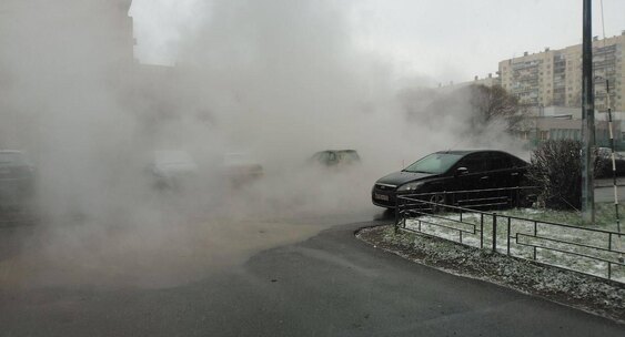 Горячим паром заволокло улицу Маршала Казакова, около дома №28/3.КП - Санкт-Петербург