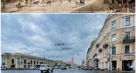 На литографии Карла Беггрова, выполненной по рисунку Ермолая Ивановича Есакова в 1823 году, представлена панорама Невского проспекта от Садовой улицы к Адмиралтейству.Вечерний Санкт-Петербург