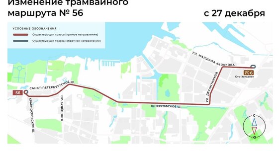 Как сообщает 26 декабря пресс-служба СПб ГКУ «Организатор перевозок», после открытия «Юго-Западной» меняется маршрут трамвая № 56.Фонтанка.Ру