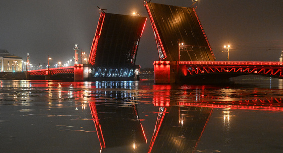 В 2025 году красную подсветку Дворцового моста впервые сопроводили разводкой пролетов под звуковое шоу «Поющие мосты».Вечерний Санкт-Петербург
