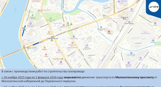 В Красногвардейском районе в связи с производством работ по строительству газопровода закроют движение транспорта по Малоохтинскому проспекту от Малоохтинской набережной до Перевозного переулка.Бриф24