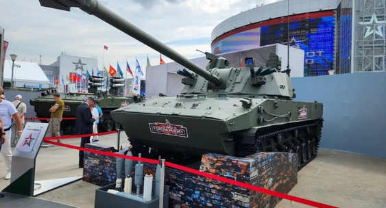 Подчёркивается, что самоходка оснащена гаубицей 2А80-1 калибра 120 миллиметров, которая может запускать новые управляемые ракеты с дальностью действия 25 км.RT на русском