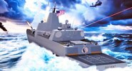 На презентации в декабре был показан эскиз изящного военного корабля под названием Defiant ("Дерзкий"), рассекающего бурные воды, с лазерным лучом, выходящим из палубы, и дымом, поднимающимся от цели на заднем плане.РИА Новости
