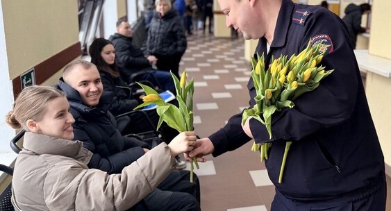 Во время поздравления прекрасным дамам было вручено около 200 тюльпанов.Regions.ru